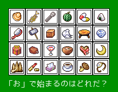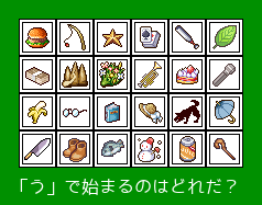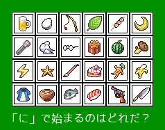 表示されるパネルを使用して「しりとり」をします。 ただしパネルの読み方は一つではありません。 例えばリンゴの絵は、りんご、アップル、くだもの、ちえのみ等 回答者の発想次第で裏読みができます。